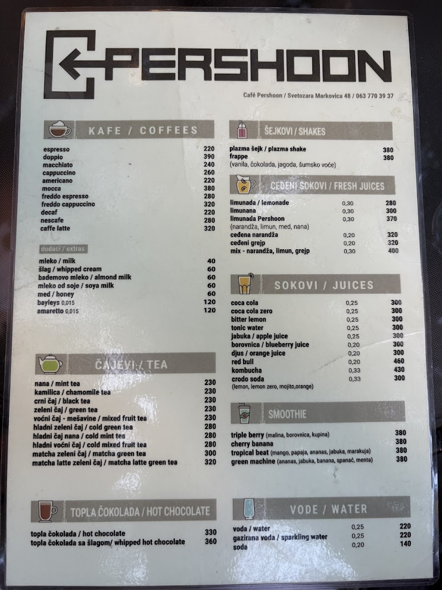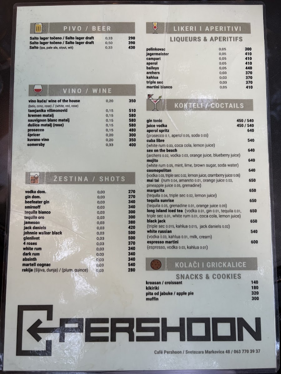 Welcome to Pershoon, a charming cafe nestled in the heart of Belgrade at Svetozara Markovića 48. This cozy spot boasts a relaxed atmosphere, inviting music, and a community vibe that's hard to resist. The menu highlights a selection of craft and pale ales, making it a haven for beer enthusiasts.
